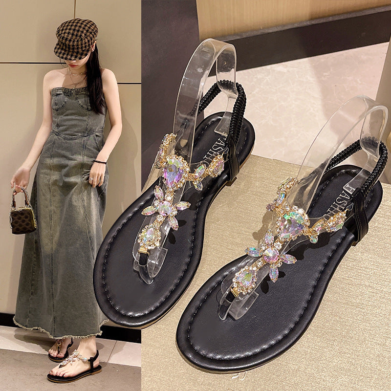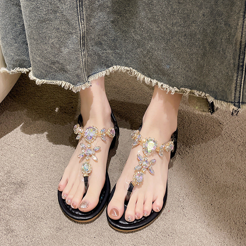 Classic Style Flat Flip-toe Rhinestone Simple Sandals For Women
